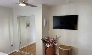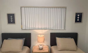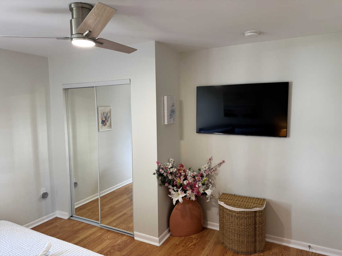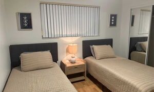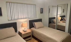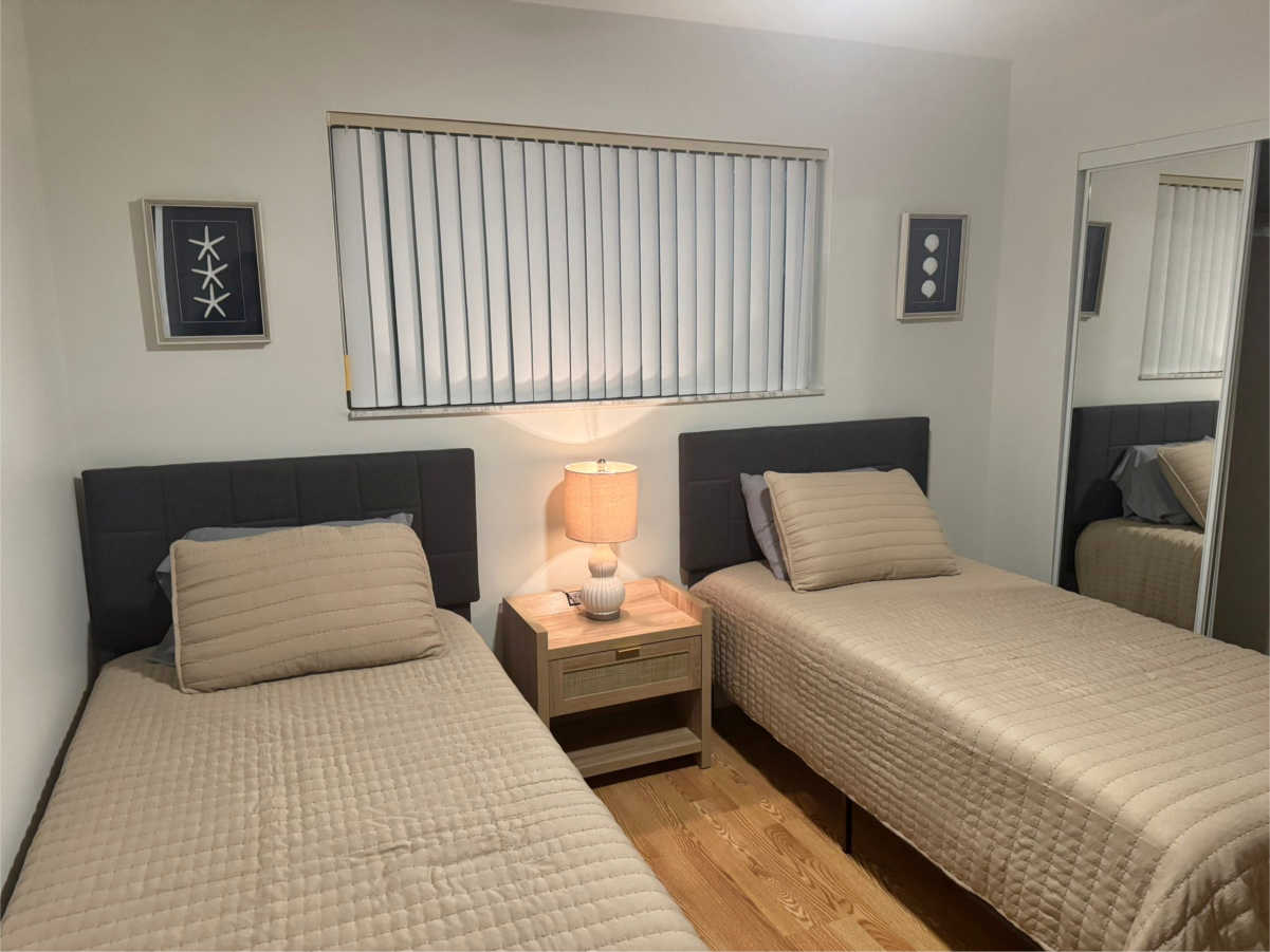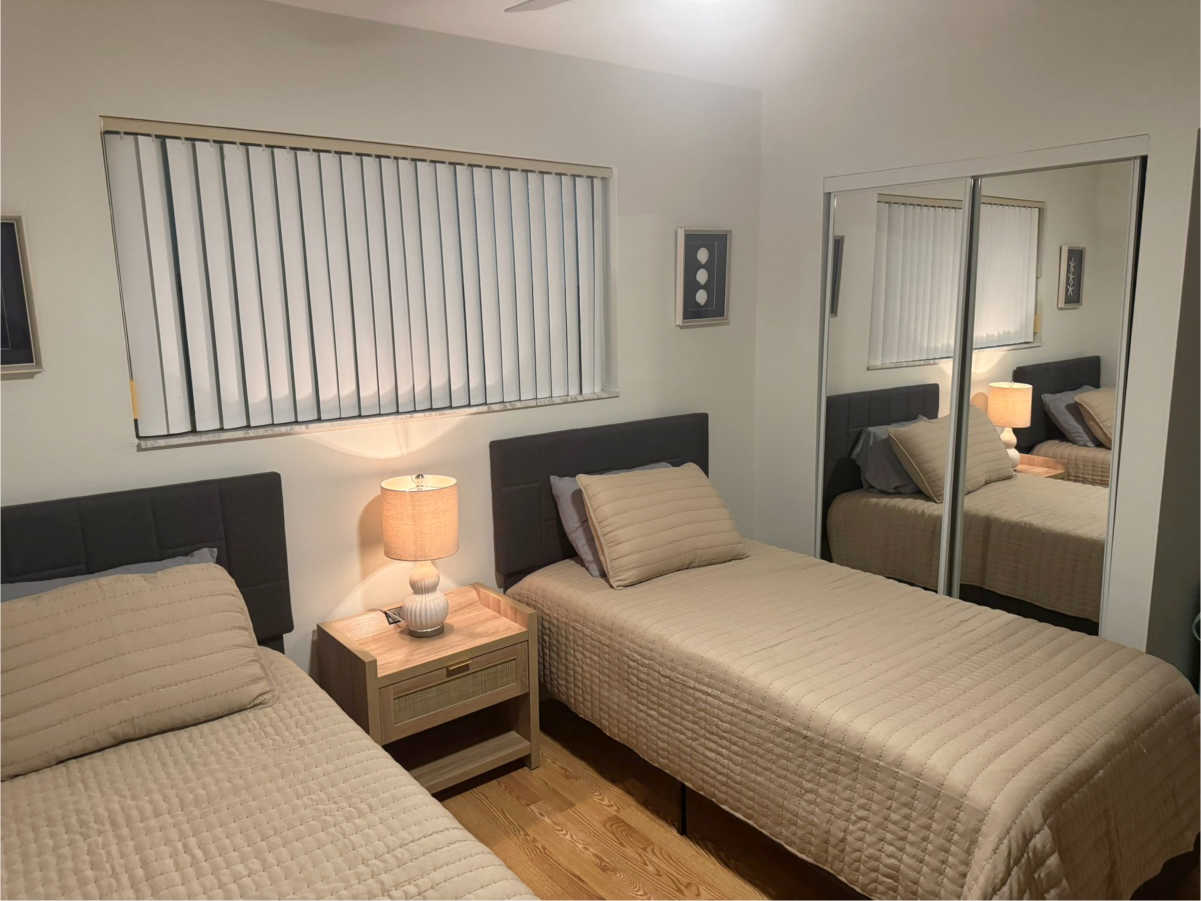 2x Einzelbett 90x180 cm, Begehbarer Kleiderschrank mit Schubladen, HD LED TV, Ventilator, Nachtisch mit Lampe.