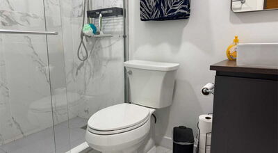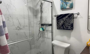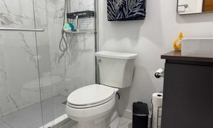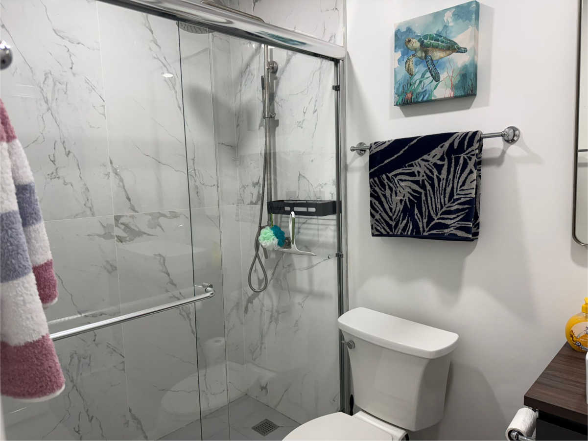 Master Bathroom: Marmor Regendusche, Toilette, Waschbecken, Schrank, Handtuchstangen, Hochwertige Einrichtung.